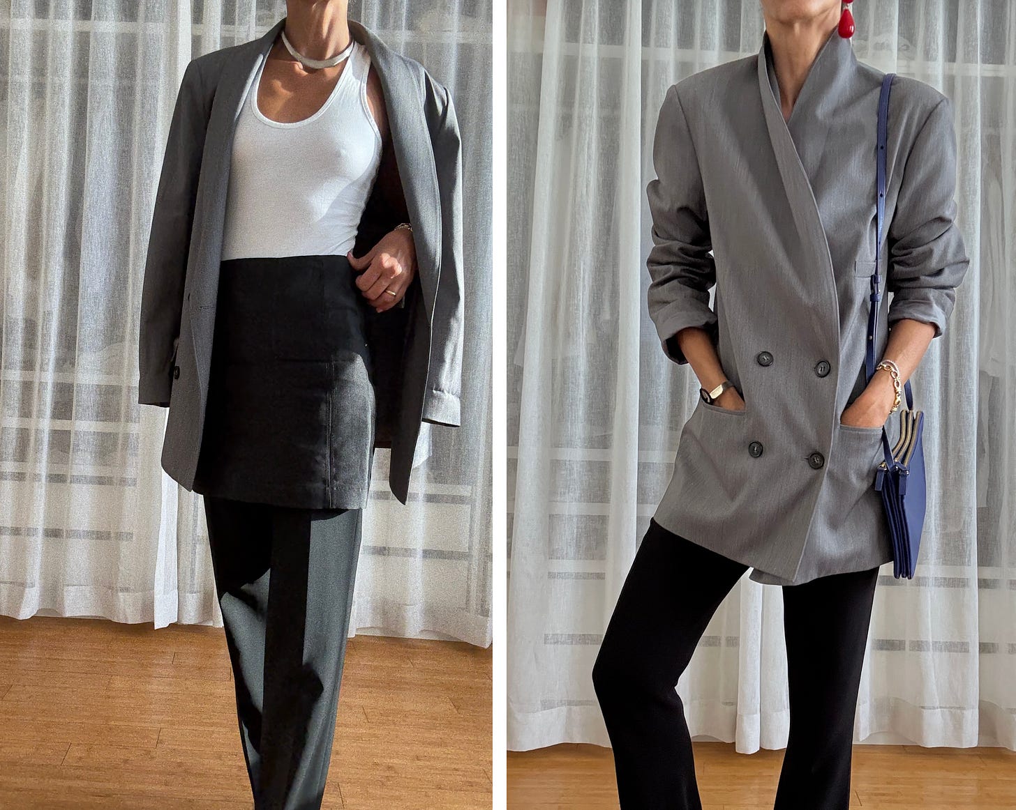 That’s not to say a hulking shoulder is banned from the youthful narrative, that would be ridiculous. But these are serious clothes, with serious price points. Their exactitude lands most convicingly as soft armour on a woman who’s earned it. A deliberate depiction of the female identity as it enters and endures the workforce, the complications of marriage, motherhood, feudal friendships and the thrill of living extraordinarily. Bristling against coyness, resisting frailty, assuming power in being all buttoned up. God, I love a good blazer.