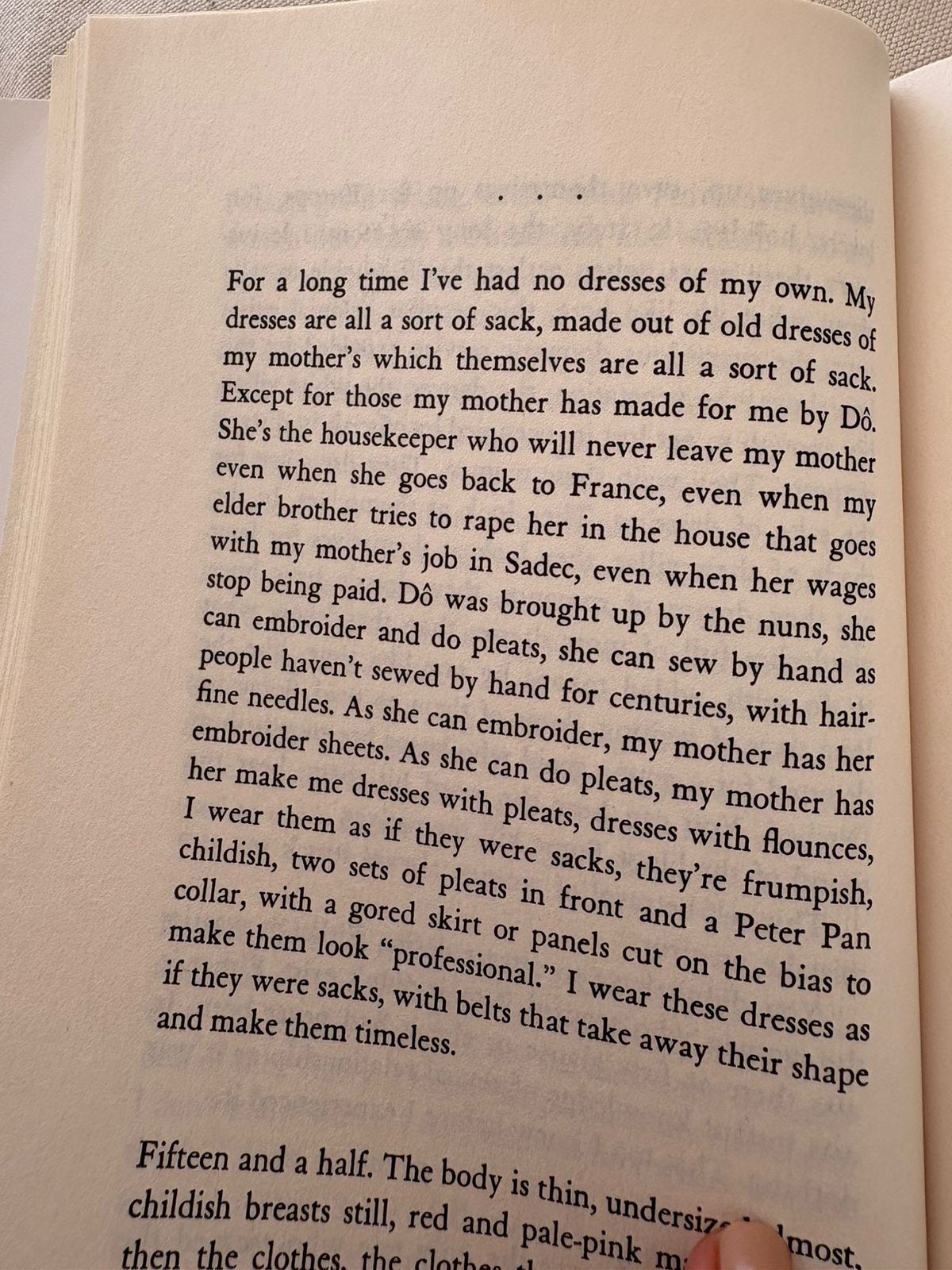 The good book: The Lover, by Marguerite Duras. My artsy friend Chafa said her writing is like water. Molten, erotic. Sad too – terse, a condiment to seasonal heat. I like when authors linger on clothes, the worn out silk sack dress, the derelict fedora. Here’s an excerpt.
