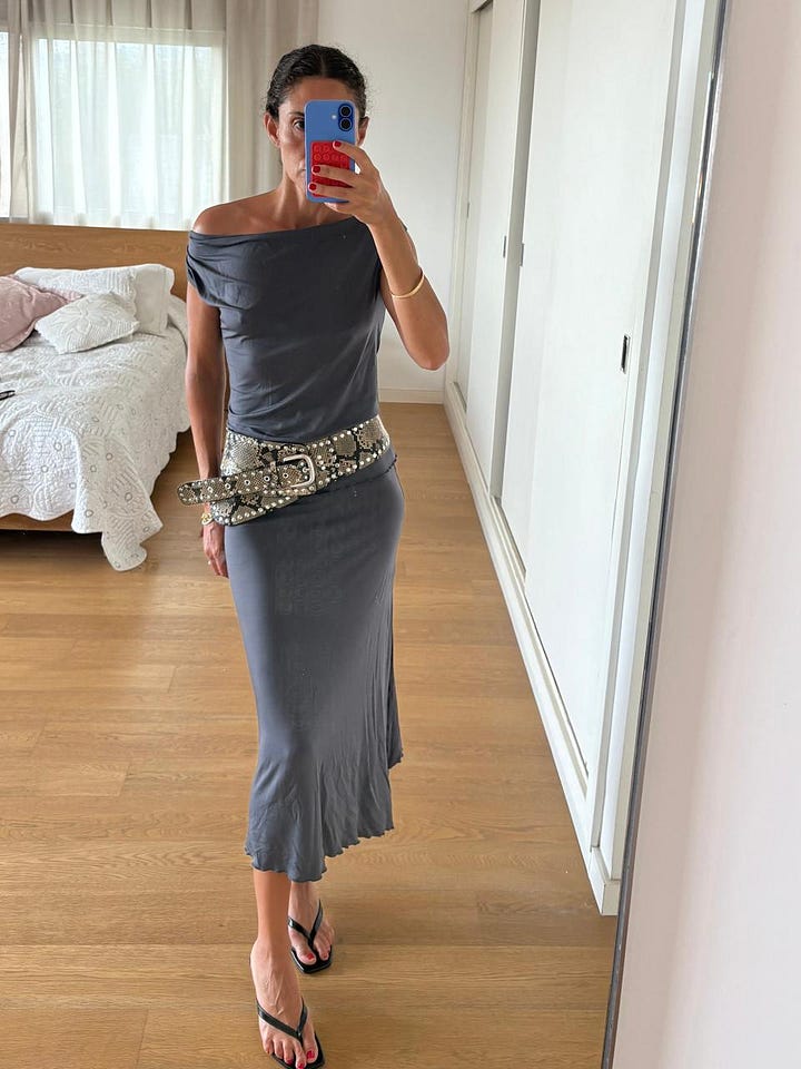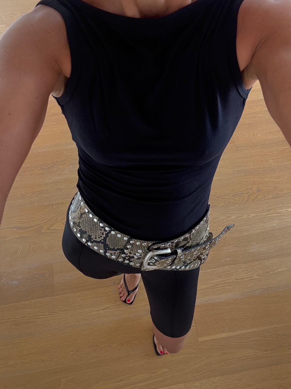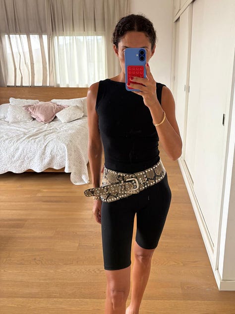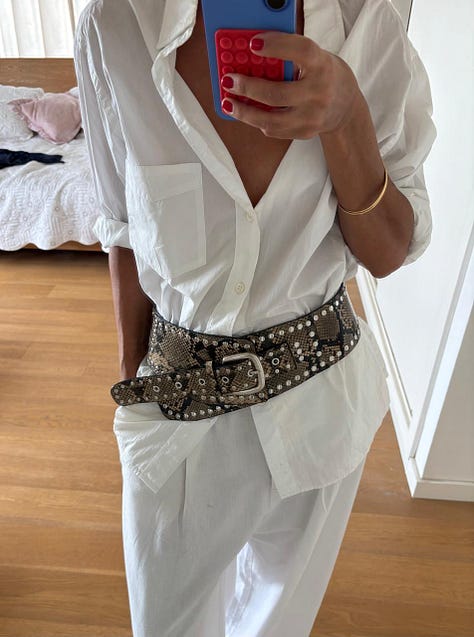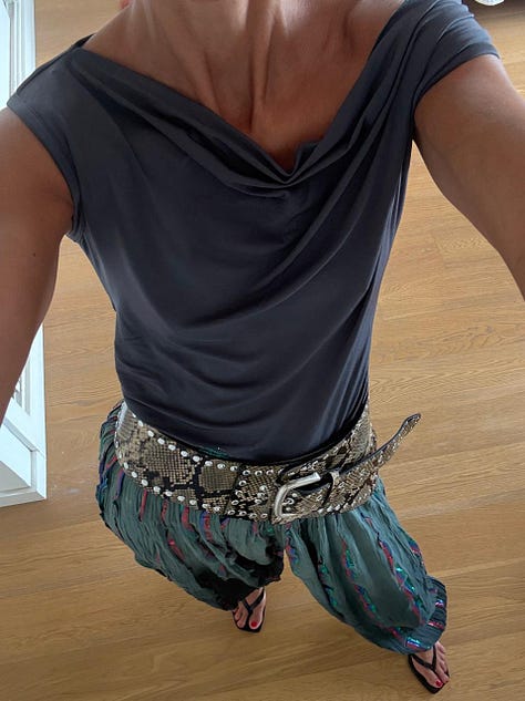I’ve been wearing this gaudy belt all summer. It gives friction to outfits that feel too clean, too correct. I’m angling for frothing energy, not serenity. A big, bulky accoutrement imposes itself – a deliberate chastity belt, as flippant as it is assuming.