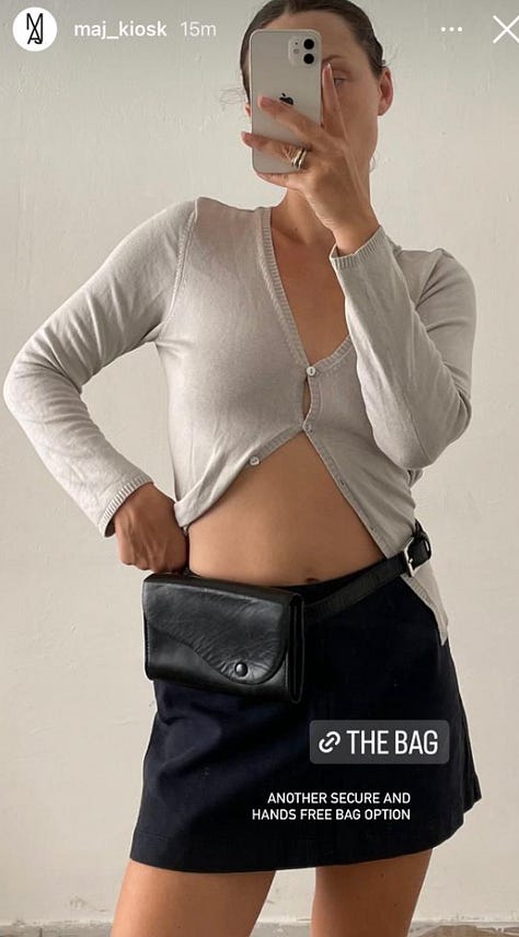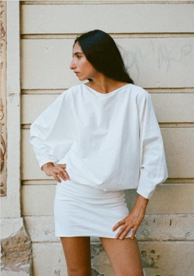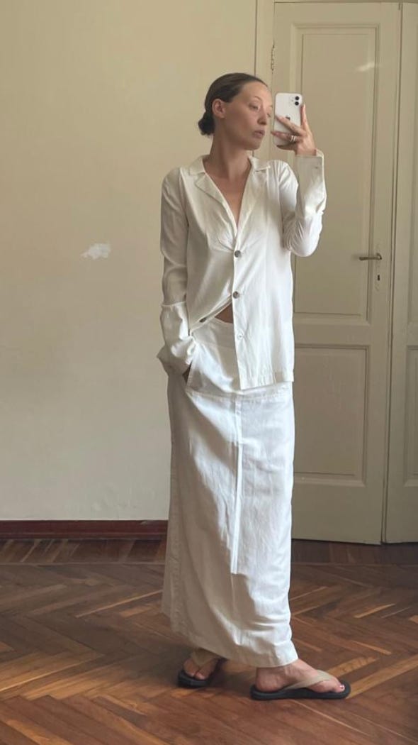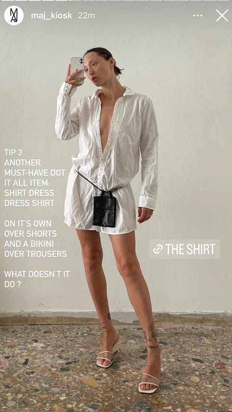 Maj Kiosk is the salve. Second-hand archival Italian brands – Sergio Tacchini, Ferré, a little Fiorucci, a smattering of forgotten Benetton and Sisley. Gauzy linens, threadbare cotton dresses, tailored trousers in the muted palette of a Milanese heiress who’s lost her fortune, but not her sensibility. The founder, Zoë Zissovici, models much of it on Stories. It’s hard to say if it’s the clothes or the effortless way she wears them that makes me want to burn my closet, slick back my hair, and move to Sicily.